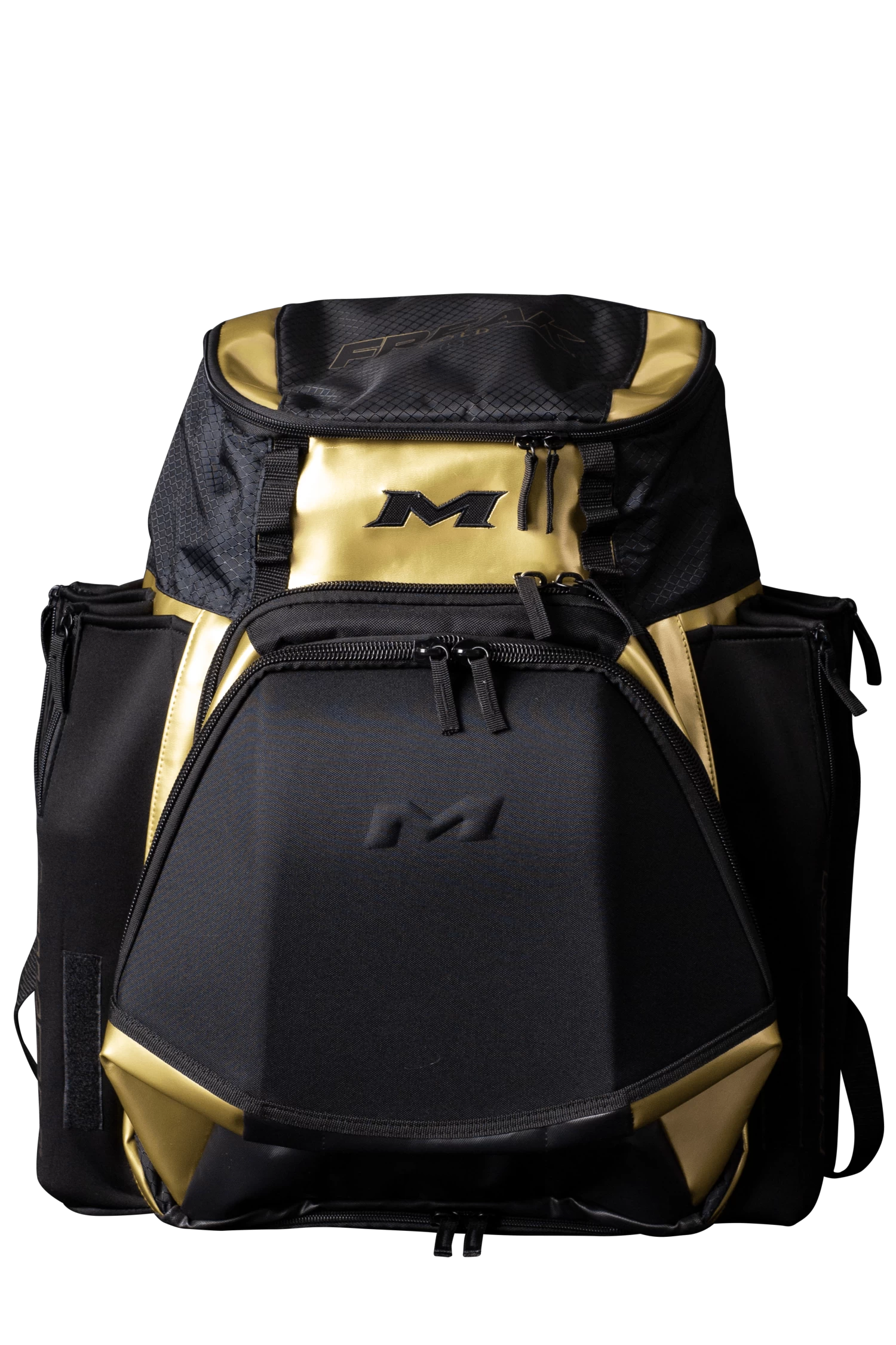 The all new Freak Gold MK7X Series Miken XL Backpack features: 4 zippered neoprene bat sleeves, a durable “J” style fence hook, 2 fleece lined pockets in top valet tray (for phone, accessories, etc), Glove storage, Molded front pocket that converts to shelf, Easy to clean tarpaulin bottom, and a Daisy chain for external batting glove storage.