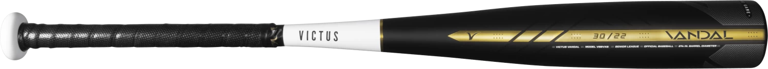 Engineered with an ultra-balanced design and carbon composite barrel-end, this one-piece aluminum hybrid bat boasts faster exit speeds through the zone. The Vandal combines a ringless barrel, made of Multi-Variable walls for a more flexible sweet spot, with a pro-tapered handle and micro-perforated soft-touch grip for the unmatched performance we all expect from a Victus Bat.